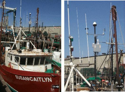 Figure 3. One of the FleetLink vessels, F/V Susan & Caitlyn at the dock in Portland (ME) Harbor (above, left) with a close-up of the sensors of the mast (above, right).